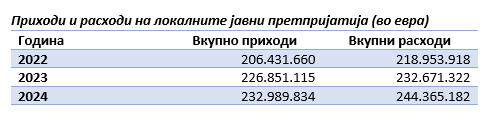 Инаку, загубите на локалните јавни претпријатија во 2024 година се зголемени во однос на 2023 година дури за 56 %, односно за 6,2 милион евра. Во последните неколку години зголемен е и бројот на претпријатија што работеле со загуба и тоа од 54 во 2023 година на 71 претпријатие во 2024 година. Соодветно на тоа, намален е бројот на претпријатија што оствариле добивка во 2024 година, но вредноста на добивката на овие претпријатија е зголемена. Во 2024 година вкупната добивка изнесува околу 5,4 милиони евра што е за 24 % повеќе од 2023 година.