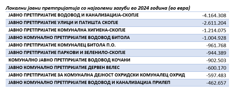 Вкупните загуби само на првите 10 претпријатија со најголеми негативни финансиски резултати изнесуваат 13,5 милиони евра, што е дури 77% од вкупните загуби на локалните јавни претпријатија.