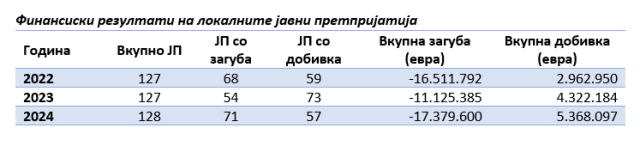 Според податоците од завршните сметки за минатата, 2024 година, од вкупно 128-те локални јавни претпријатија чии основачи се општините, дури 71, односно 55% ја завршиле годината со загуба. Вкупните загуби на овие 71 претпријатие изнесуваат 17,4 милиони евра.