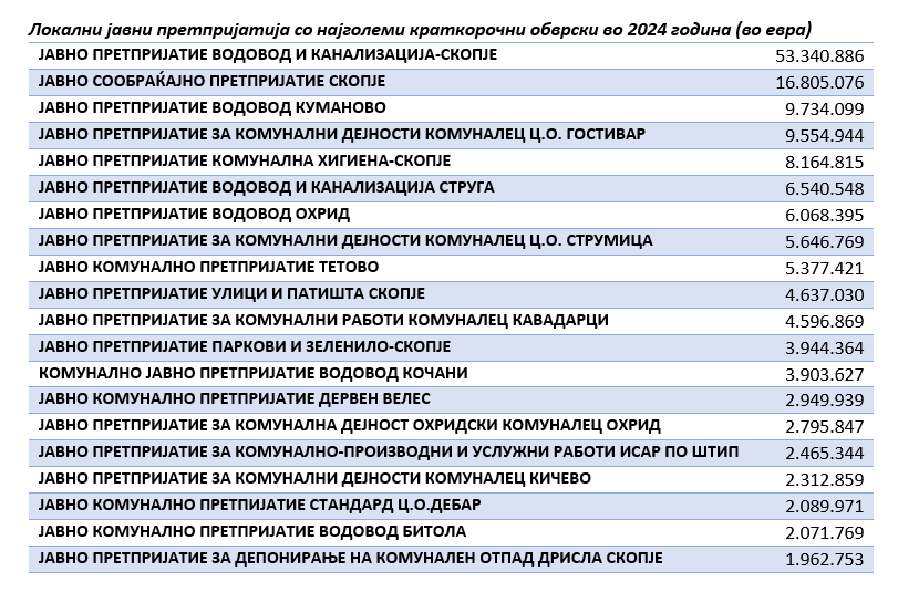 Уште поголеми од загубите се долговите на локалните јавни претпријатија, мерени преку нивните краткорочни обврски. Според нивните завршни сметки, дури 126 од 128-те локални јавни претпријатија имаат долгови кои вкупно изнесуваат 193,2 милиони евра.