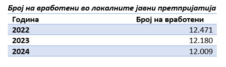 Инаку, бројот на вработени во локалните јавни претпријатија е во благ пад. Во 2024 година бројот на вработени изнесува 12.009 што е за 171 вработен (1,4 %) помалку од 2023 година, односно 462 вработени (3,7 %) помалку од 2022 година.