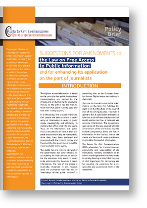 Policy DocumentsRecommendationsPolicy Brief: Suggestions for amendments to the Law on Free Access to Public Information and for enhancing its application on the part of journalists04/03/201320Policy Brief: Suggestions for amendments to the Law on Free Access to Public Information and for enhancing its application on the part of journalists Post Views: 20 previous Research of current practices: Transparent local governance next Macedonian and Bulgarian journalists shared experiences on free access to public information