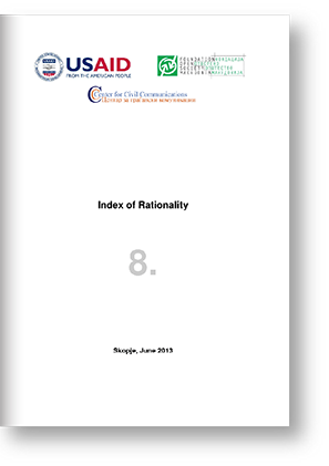 SKOPJE, June 26, 2013 – The Center for Civil Communications has announced today the Index of rationality 8 which compares prices by which different state institutions on central and local level buy the very same products and services. This eighth issue of the index is done for purchasing of work clothes, work shoes, benches, original and compatible toner cartridges, and for disinfection, desinsection and deratization service. The highest difference in the prices has been noted in purchasing of work clothes and the lowest in original toner cartridges: